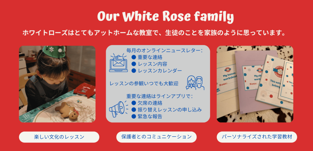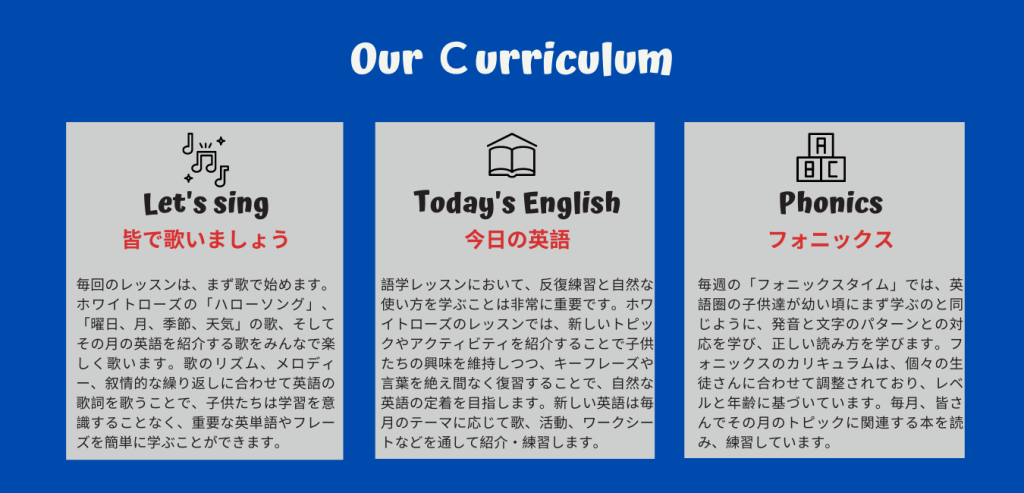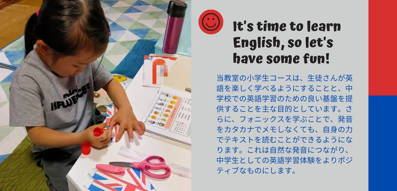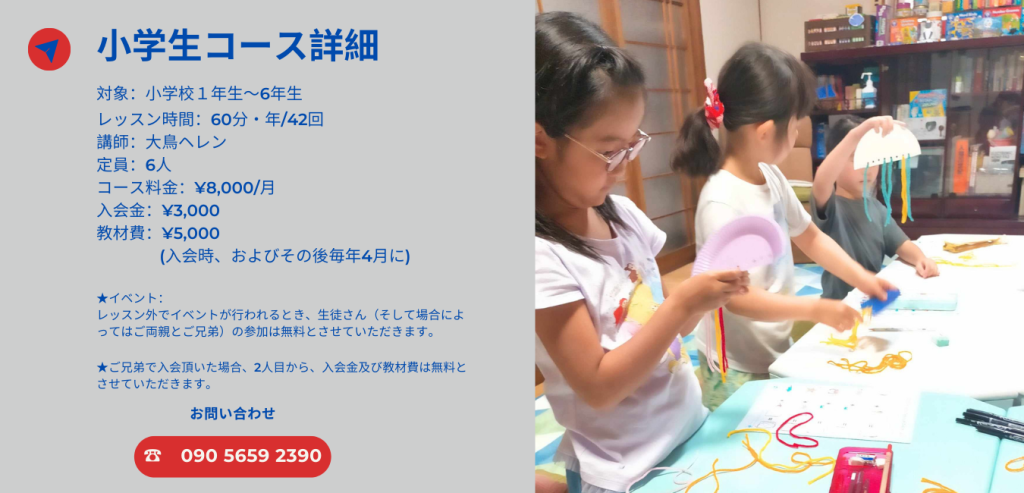 以前に通っていた教室では使わない教材がたまっていくばかりだっだのですが、オリジナルの教材を習熱度にあわせて用意していただけるので無駄なく無理なくレッスンを受けれています。頭で英語を覚えるだけでなく、歌を歌ったり、身体を使ったりすることで、全身で英語を学べているようです。楽しいレッスンなので、子どもが嫌がることなく次のレッスンが待ち遠しいみたいです。
